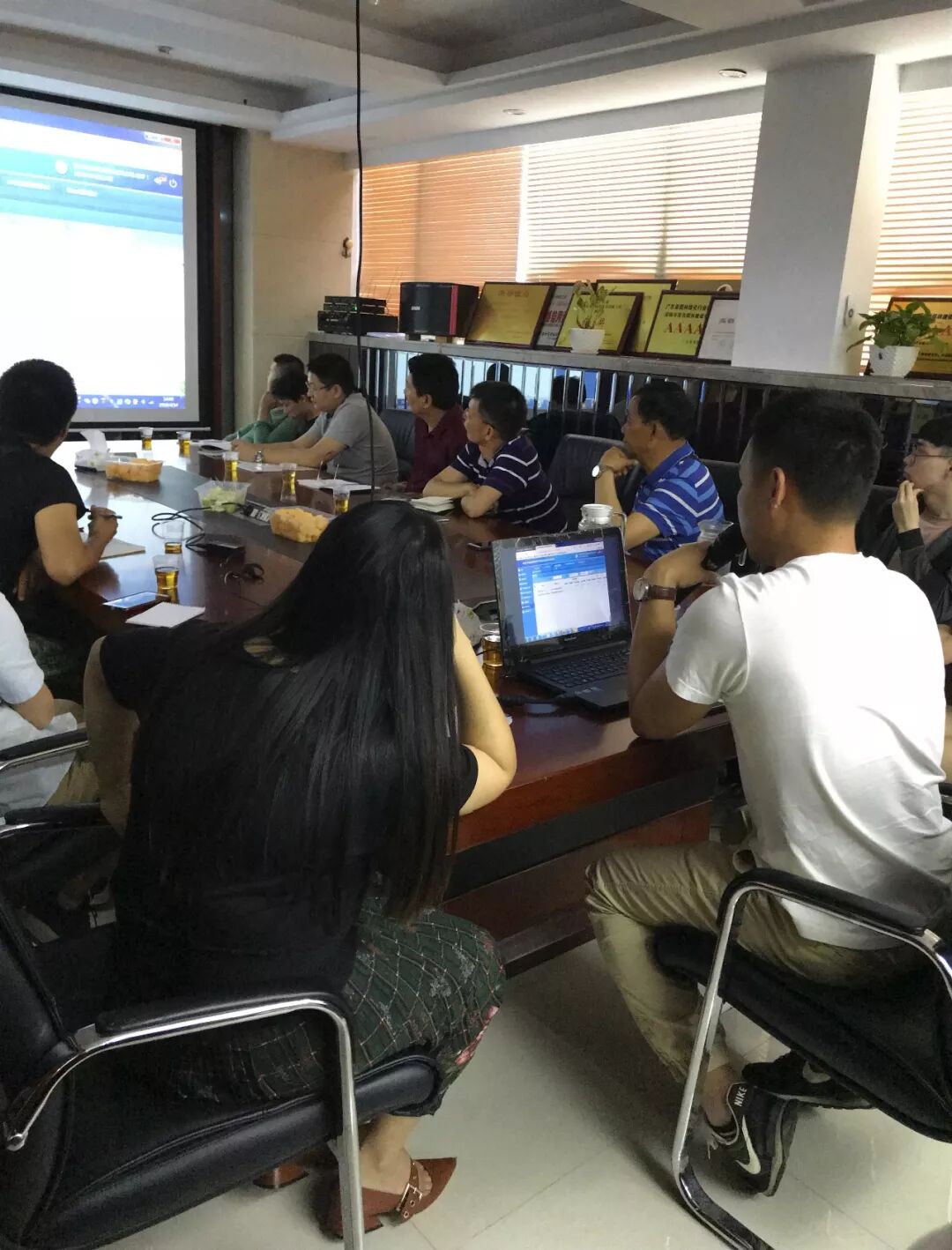 会议现场共有16名员工参与,包括各绿化养护项目部负责人、资料员以及公司总部养护工程部经理和资料员等。主讲人为张雯雯、董永奎,这两位对绿化养护精细化管理系统操作方面都非常有经验和心得。